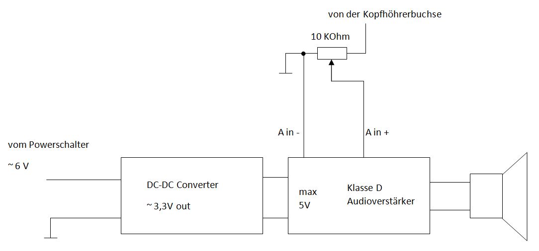 Dazu muss noch ein möglichst kleiner Audioverstärker mit möglichst hoher Effizienz eingebaut werden. Meine Wahl fiel auf einen Klasse-D Verstärker. Dieser benötigt eine Betriebsspannung von 2 bis max. 5V. Daher kommt noch ein DC-DC Wandler hinzu, der die etwa 6V der 5 Stk 1,2V Akkus auf ~3,3V umwandelt. Dieser sollte auch möglichst effizient sein, daher fiel meine Wahl auf einen Stepdownconverter.