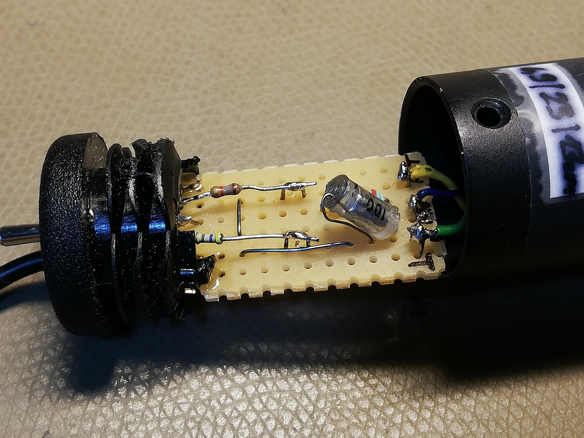 Die interne Mikrofonkapsel wurde entfernt und ich habe auch den 5,1k Widerstand ausgelötet und anstatt des Mikrofones eine Leitung zur Buchse gelegt.