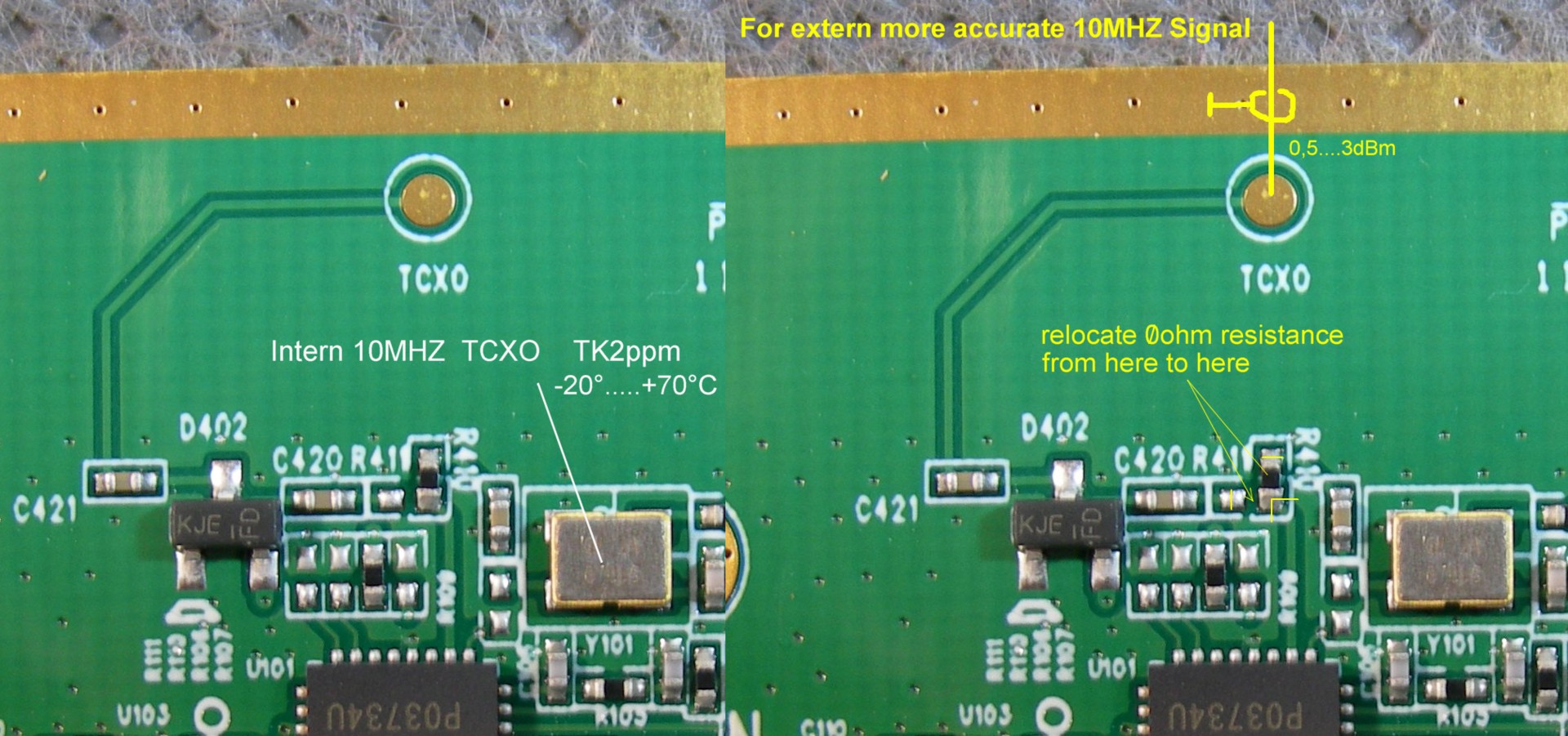 Da bereits der IC-9700 mit einer externen 10 MHz Referenz stabilisiert wird, soll auch der LO des Upconverters mit einer externen 10 MHz Referenz versorgt werden. Dazu muss eine Brücke im BU-500 Modul umgelötet und eine Zuleitung zum Referenz-Eingang verlegt werden.