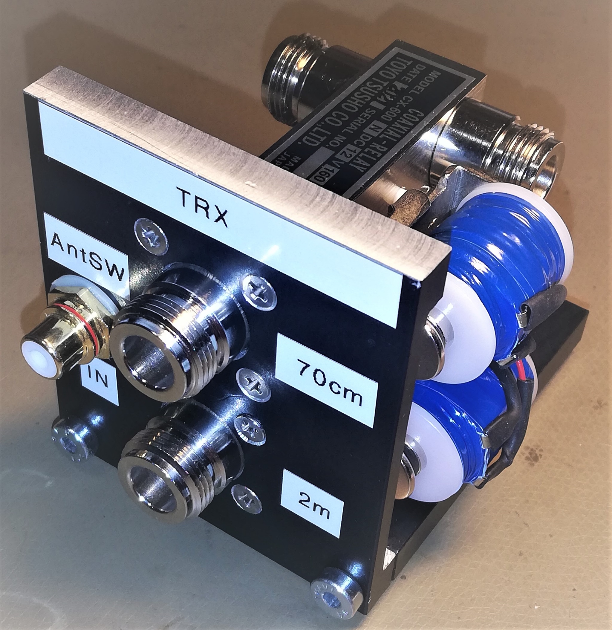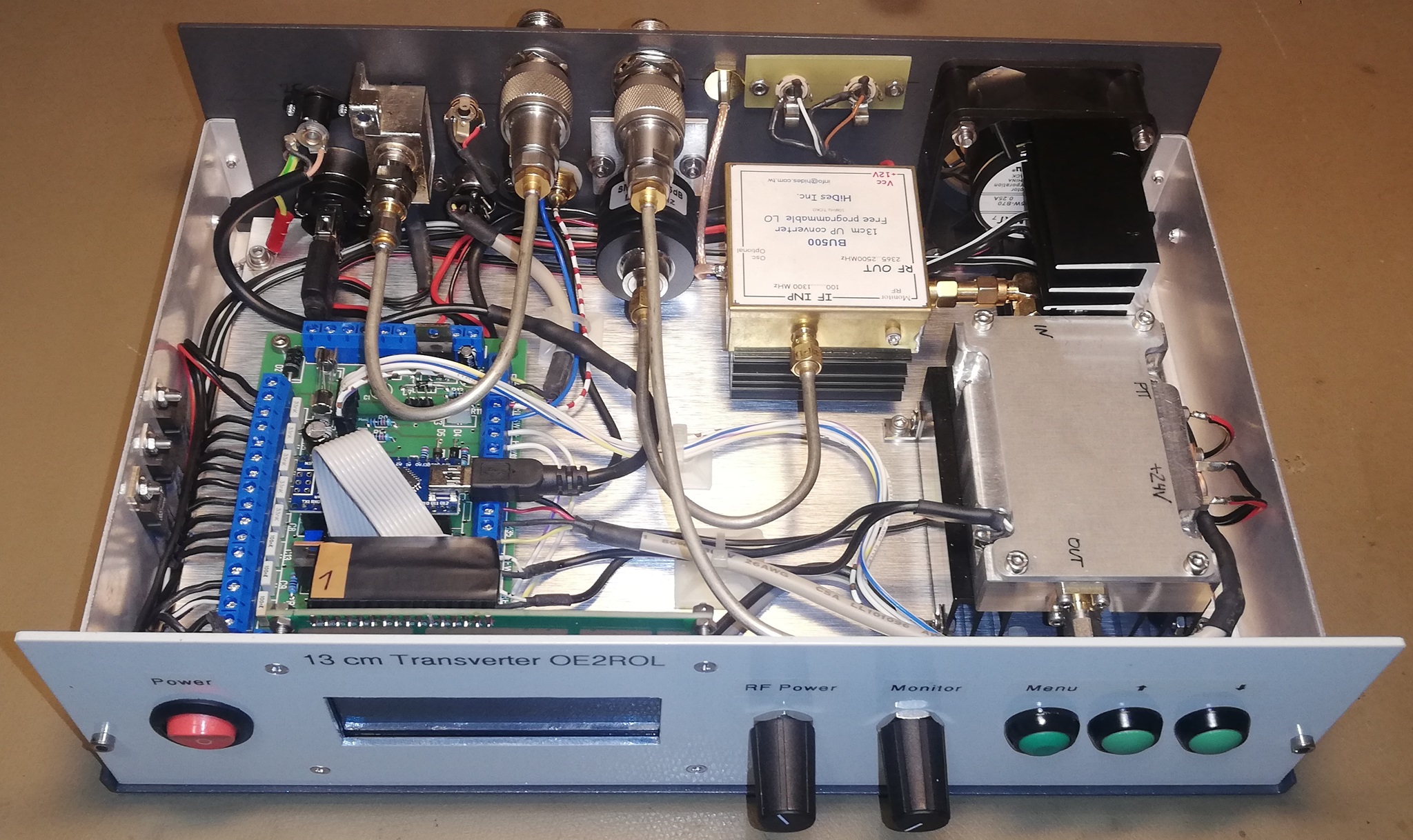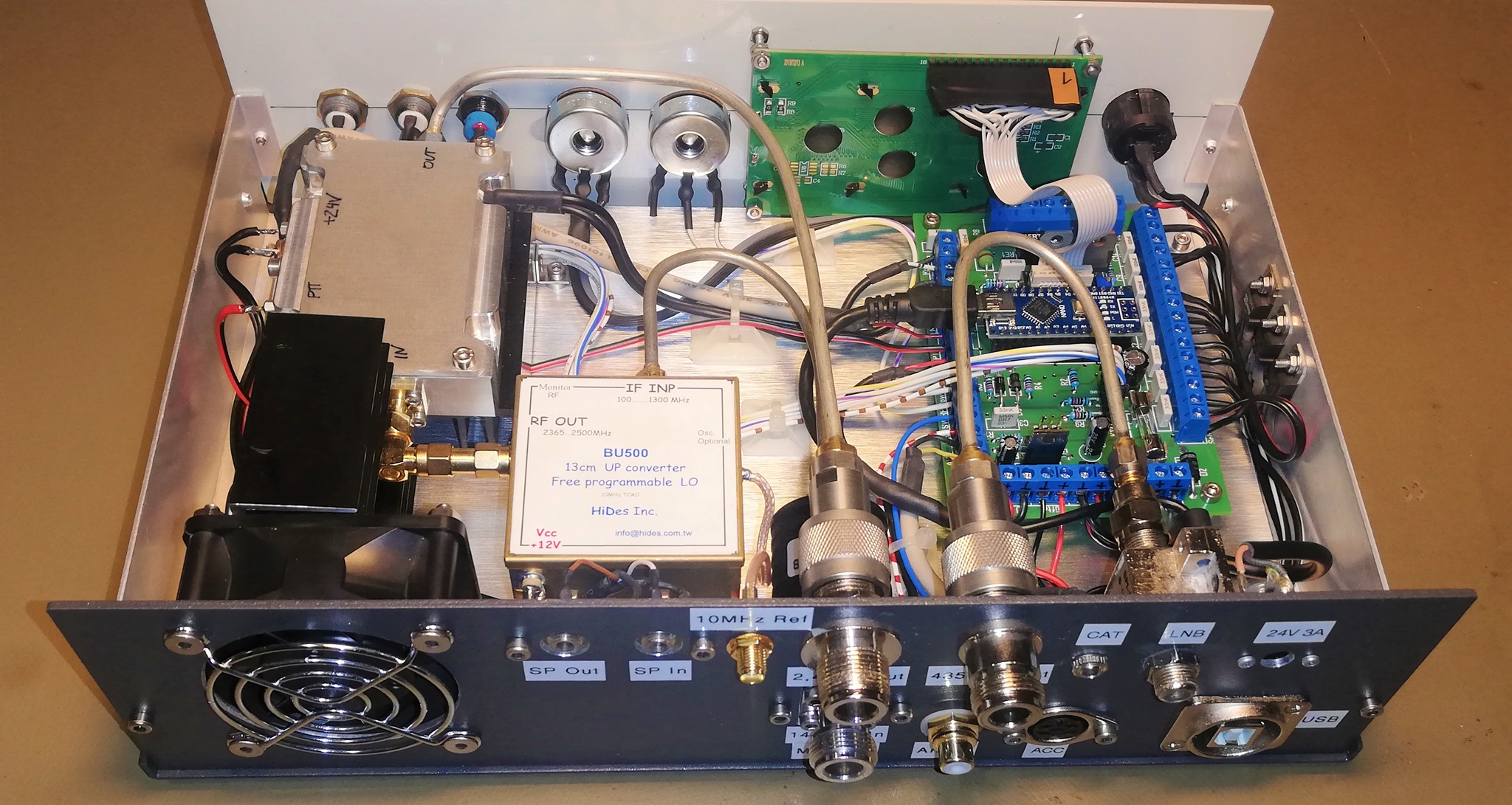 Die 2,4 GHz HF Ausgangsbuchse ist ebenfalls in N-Norm. Weiters eine DC Buchse für die 24V Spannungsversorgung, eine F-Buchse für den LNB- Anschluss, eine Klinkenbuchse für die CAT Schnittstelle, eine Dinbuchse für das PTT Signal, eine Cinch Buchse für den Schaltausgang für die Koaxrelais, eine SMA Buchse für den 10 MHz Referenzeingang, 2 Klinkenbuchsen für NF Ein- und Ausgang zum Durchschleifen des NF-Signals zu einen externen Lautsprecher und eine USB-B Buchse zum Programmieren des Arduinos.